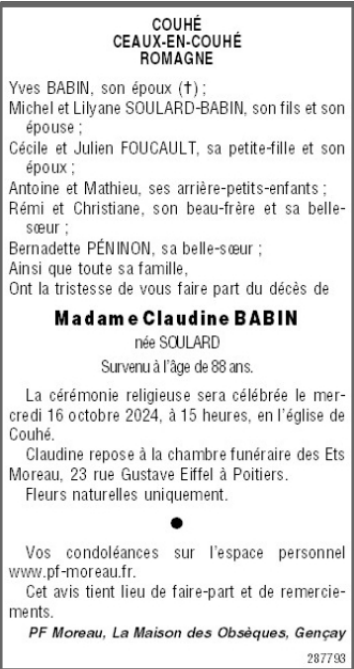 Née à Ceaux en Couhé (86700, France) le samedi 9 mai 1936