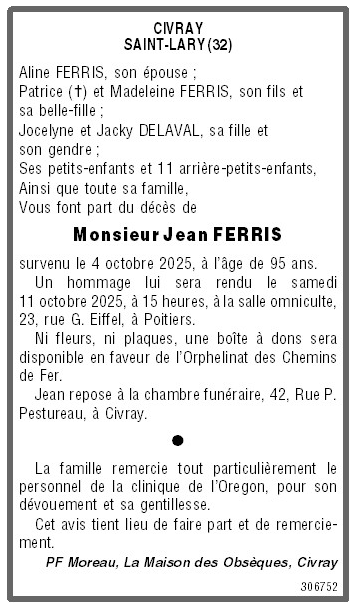 Décédé à Civray (86400, France) le samedi 4 octobre 2025 à l'âge de 95 ans