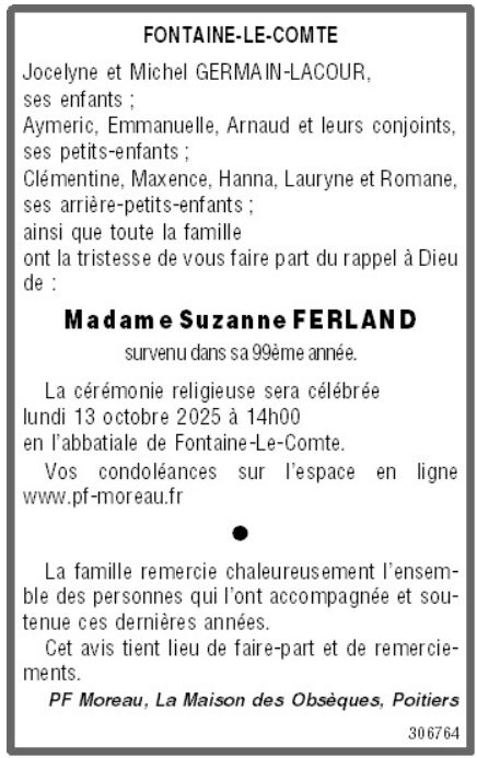 Décédée à Fontaine-le-Comte (86240, France) le samedi 4 octobre 2025 à l'âge de 99 ans