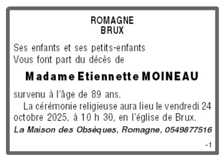 Décédée à Civray (86400, France) le lundi 20 octobre 2025 à l'âge de 89 ans