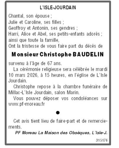 Décédé à Poitiers (86000, France) le mardi 3 mars 2026 à l'âge de 67 ans