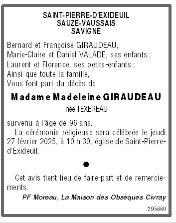 Madame Madeleine GIRAUDEAU née TEXEREAU