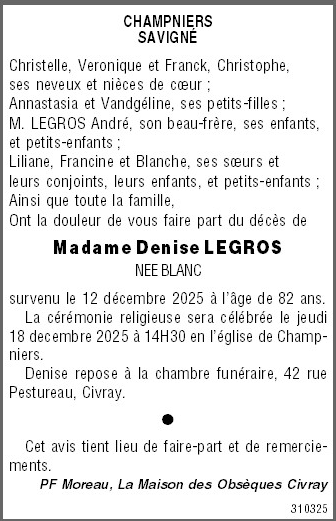 Décédée à Châtellerault (86100, France) le vendredi 12 décembre 2025 à l'âge de 82 ans