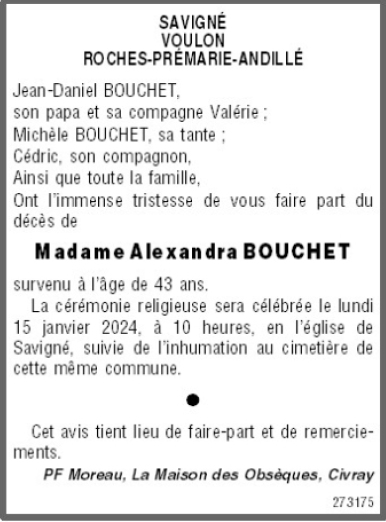Décédée à Roches-Prémarie-Andillé (86340, France) le jeudi 28 décembre 2023 à l'âge de 43 ans