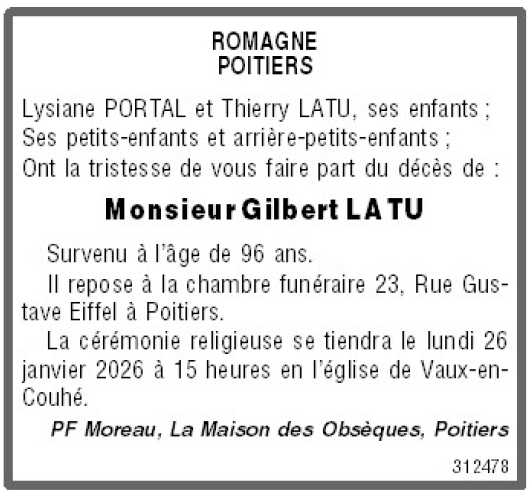 Décédé à Fontaine-le-Comte (86240, France) le vendredi 16 janvier 2026 à l'âge de 96 ans