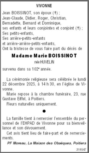 Décédée à Vivonne (86370, France) le mardi 16 décembre 2025 à l'âge de 101 ans