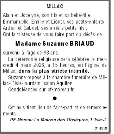 Décédée à L'Isle-Jourdain (86150, France) le vendredi 27 février 2026 à l'âge de 98 ans