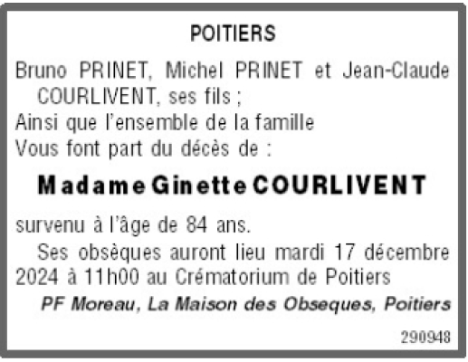 Décédée à Poitiers (86000, France) le samedi 7 décembre 2024 à l'âge de 84 ans
