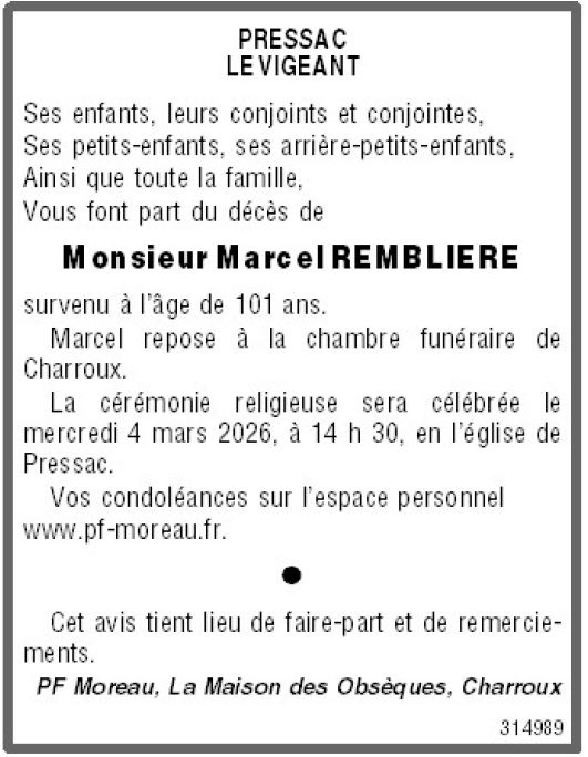 Décédé à Pressac (86460, France) le vendredi 27 février 2026 à l'âge de 101 ans