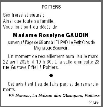 Décédée à Mignaloux-Beauvoir (86550, France) le lundi 13 janvier 2025 à l'âge de 67 ans