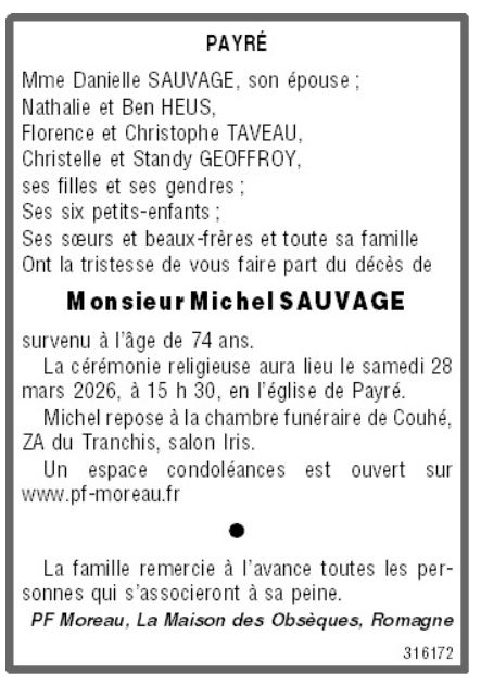 Décédé à Payré (86700, France) le lundi 23 mars 2026 à l'âge de 74 ans