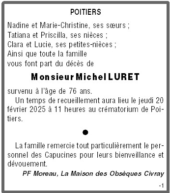Décédé à Civray (86400, France) le mardi 11 février 2025 à l'âge de 76 ans