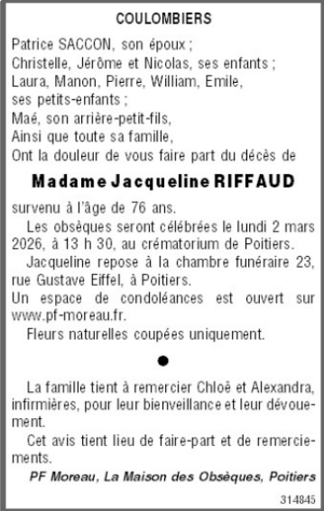 Décédée à Poitiers (86000, France) le mardi 24 février 2026 à l'âge de 76 ans