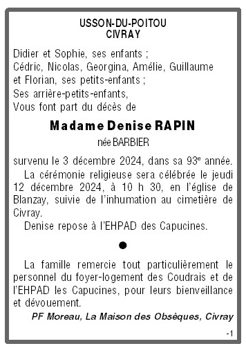 Décédée à Poitiers (86000, France) le mardi 3 décembre 2024 à l'âge de 92 ans