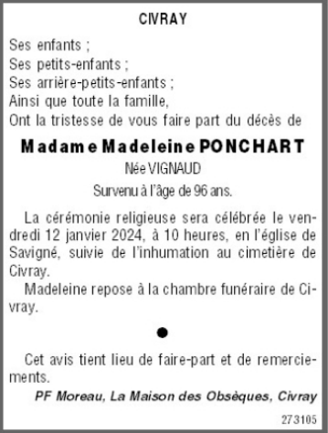 Décédée à Chaunay (86510, France) le lundi 8 janvier 2024 à l'âge de 96 ans