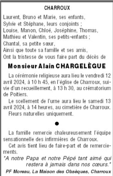 Décédé à Charroux (86250, France) le dimanche 7 avril 2024 à l'âge de 81 ans